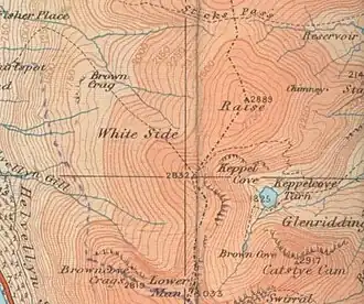 Strictly the name White Side refers to the western slope of a nameless summit. However it is often applied to the whole fell for convenience as was done by Alfred Wainwright.[1] He gave White Side the status of a separate fell, a position followed by other guidebook writers.[2][3] Wainwright suggested that the fell name could have come from the quartz found on the western slope.