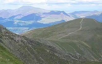 The summit bears a small cairn in a sea of grass with the main ridge path crossing the highest point. Other than north and south where higher fells intervene, the view is good.[1] The subsidiary top of Brown Crag (2,000 feet, 610 m) on the western face also provides fine views of Skiddaw and The Dodds.[2]
