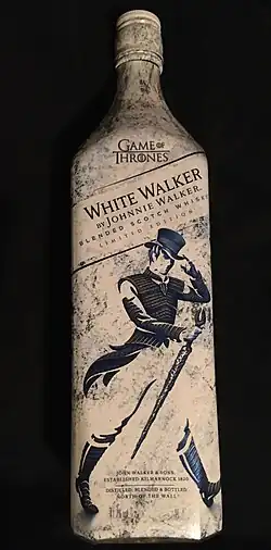 In 2012, Funko released a White Walker figure as part of their POP! Television line, which are 4.5 inch vinyl figures in the Japanese super deformed style.[28] The company later produced a Mystery Mini Blind Box figurine of a stylized White Walker.[29] Dark Horse released a 9-inch White Walker bust statue in 2013,[30][31] and later a 9-inch full figure statue.[32] In 2014, Funko released a 6.5 inch articulated White Walker action figure (with spear accessory) as part of their HBO-licensed Legacy Collection line, which features "some of the series’ most popular characters".[33][34] In 2018, Johnnie Walker released White Walker, the first of several Game of Thrones-inspired whiskies.[35]