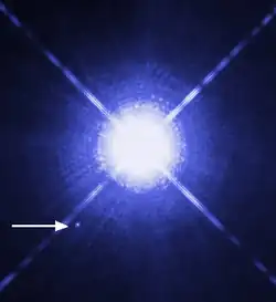Image of the Sirius system taken by the Hubble Space Telescope. Sirius B, which is the closest white dwarf to Earth, can be seen as a faint point of light to the lower left of the much brighter Sirius A.