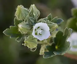 It is an annual herb growing mostly decumbent along the ground with hairy stems approaching 40 cm (16 in) in maximum length. The leaves are up to 2.5 cm (0.98 in) long and have three to five lobes which may be toothed at the tips. Solitary flowers can be found in the leaf axils, each a white, pink, or very pale purple cup usually less than 1 cm (0.39 in) wide. The fruit is disc divided into up to 13 segments. It flowers in the late winter to spring.[2][3]