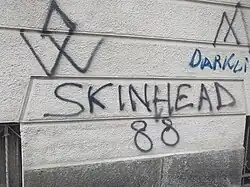 The central themes of white power skinheads revolve around "the ethnic war which will be waged in the future and the denunciation of a global Jewish conspiracy to promote miscegenation" (see White genocide conspiracy theory).[90] The white power skinhead movement is generally associated with neo-Nazism, in part, this is due to its origins in the National Front and the British Movement, along with the presence of former Nazis (especially former members of the SS) who mentored members of nascent German racist skinhead groups in the 1980s–1990s. Historian John F. Pollard contends that "the racist skinhead ideology is fundamentally neo-Nazi in inspiration."[91] Camus and Lebourg also argue that although not all racist skinheads can be classified as 'neo-Nazi', neo-Nazism remains hegemonic in the far-right skinhead movement.[90] Scholars concede at the same time the difficulty of separating the public use of the provocative and subversive aesthetics surrounding Nazi symbols from actual belief in, and commitment to, Nazi ideology.[91][90]