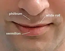 White roll is the white line that borders the top of the upper lip.[1][2] It is an adnexal mass of specialized glands and fat. White roll occurs naturally for nearly everyone, although it can be not white and less visible for dark skinned individuals. Well defined white roll indicates youthfulness and is considered aesthetically pleasing.[3]