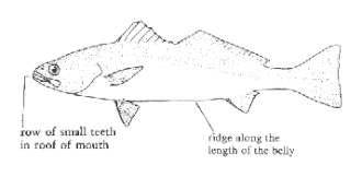 The body of the white seabass is elongate, and somewhat compressed. The head is pointed and slightly compressed. The mouth is large, with a row of small teeth in the roof; the lower jaw slightly projects. The color is bluish to gray above, with dark speckling, becoming silver below. The young have several dark vertical bars. The white seabass is closely related to the California corbina, but is the only California member of the croaker family to exceed 20 pounds in weight. The largest recorded specimen was over 5 feet, 93.1 pounds. They are most easily separated from other croakers by the presence of a ridge running the length of the belly. C The diet of white seabass includes fishes, especially anchovies and sardines, and squid. At times, large fish are found which have eaten only Pacific mackerel. At the minimum legal length of 28 inches, the average white seabass is about 5 years of age, weighs about 7.5 pounds and has been sexually mature for at least one spawning season.
