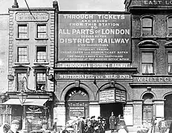 On 6 October 1884, the District Railway (DR, now the District line) opened a new station adjacent to the deeper ELR station as the terminus of an extension from Mansion House[10] (part of the extension also formed the final section of the Circle line[10][11]). The new station was given the name "Whitechapel (Mile End)". The ELR passenger service between Whitechapel and Liverpool Street was withdrawn in 1885. The station received its present name on 13 November 1901.