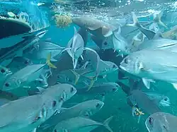Echeneis neucratoides is sometimes free-swimming, but at other times attaches itself with its sucker to a host animal such as a shark, other large fish or turtle.[6] Remoras often feed on scraps of food discarded by their hosts, and may also consume the parasitic copepods on their skin.[7]