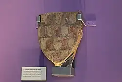 The friary was established on 14 February 1342 with the help of Sir John Poultney,[2][3] about a century after the Carmelites arrived in England. It was built on land that had previously been fields and orchards. The Carmelites were a mendicant religious order, dependent on charity from those they taught and on the gifts from pilgrims visiting their shrine of Our Lady of the Tower. According to Dugdale, 'This Chapell is in the tower of the Cittye Wall without New Gate, close by the roadway leading towards London. On the outside thereof was a picture of the blessed Virgin, richly painted, and within an image and her altar, whereat most travellers which passed by did offer more or lesse, out of confidence that their journey would be better blest'.[4] In 1344, King Edward III gave land to extend these buildings and a similar grant followed in 1352.[5] Several local benefactors left donations in the form of bequests to the friary: in 1384 Lord Basset of Drayton left the Carmelites £300 to enlarge the church, in 1419 the monastery was considerable enlarged with a gift from William Botener, of Withibroke[6] and in 1506 Thomas Bonde of Coventry left them 20 marks to assist with the rebuilding of the cloisters. The coat of arms of the Ferrers family (Earls of Derby) was found during excavations of the church, suggesting that the family had also made bequests to the order.[5] Carmelite orders were dependent on such donations to build their friaries and the Coventry house was clearly developed through a process of gradual building and enlargement as and when funds became available.[5]