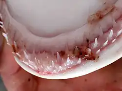 A relatively small species, few whitetip reef sharks are longer than 1.6 m (5.2 ft). The maximum length this species attains is often given as 2.1 m (6.9 ft), though this was originally based on visual observations and may be dubious.[5] The maximum reported weight is 18.3 kg (40 lb).[4] The whitetip reef shark has a slim body and a short, broad head. The snout is flattened and blunt, with large flaps of skin in front of the nares that are furled into tubes. The eyes are small and oval with vertical pupils and prominent ridges above, and are often followed by a small notch. The mouth has a distinct downward slant (imparting a disgruntled expression to the shark), with short furrows at the corners. There are 42–50 tooth rows in the upper jaw and 42–48 tooth rows in the lower jaw. Each tooth has a single narrow, smooth-edged cusp at the center, flanked by a pair of much smaller cusplets.[2]