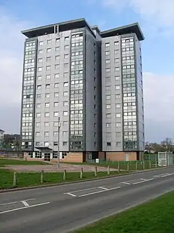 The Whitlawburn area itself is dominated visually by six near-identical 13-storey tower blocks (named Arran, Ailsa, Benmore, Bute, Kintore and Roslin and containing 432 apartments)[5][6][7] on the south side of the main road through the district, with modern "Plattenbau" style tenement blocks arranged in a grid pattern to either side. A retail area was positioned at the centre of the estate - originally this was an Asda supermarket (one of the first in Scotland) which was constructed in 1975, but this site is now a (Nisa, Greggs, William Hill, soft play area, etc.).[8] Built using the Reema method of construction (a large panel system) and originally uniformly grey concrete and brutalist in appearance, the area was regenerated from the 1990s onwards with the tenement buildings painted/rendered in brighter colours and given pitched roofs (they had originally been flat-roofed[9] despite the frequently wet conditions in the west of Scotland) and the tower blocks fitted with cladding, roofs and ambient lighting in a £21m project.[10][11]