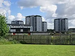 The local community centre[19] featuring a 5-a-side football pitch is situated to the south of the towers, as are two small 21st century housing zones: a development of large private residences with a separate vehicle entrance off the bypass road, known as Lomond View, and a group of 100 modest houses built by West Whitlawburn Housing Co-operative accessed from the main road.[20] These properties back onto farmland and a golf course (Kirkhill Golf Club)[21] which are part of the green belt at the edge of the Glasgow urban area. However, in 2016 a planning application by Persimmon for 240 new houses in a vacant field (accessed via the road passing the golf club) was approved for construction,[22] despite some concerns regarding possible flooding and school provision.[23][24] With the development nearing completion in late 2019, residents were surprised to find that their streets were still within the boundaries of the East Kilbride constituency for the 2019 United Kingdom general election, as had been the case before its construction when the land was a field and therefore of little consequence in that context.[25]
