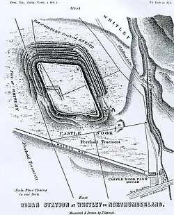 The fort was surveyed by R. G. Collingwood and described by him in his Archaeology of Roman Britain, 1930, where he noted the fort's uniquely skewed shape and extraordinary set of defensive ramparts on the western, uphill side.[22] Pottery excavated in the 1950s suggested that the fort was constructed in 122 AD, at the same time as Hadrian's Wall.[18] A survey in 2007–8 by English Heritage[5] showed a large Roman civilian settlement or vicus to the north and west of the fort. Artefacts found include coins, pottery, glass, objects made of jet, and inscribed stones.[23] In 2012, the University of Durham carried out a geophysics survey.[24] In the absence of a full excavation, archaeologists have exploited the diggings of moles to uncover Roman artefacts by sifting earth thrown up by the animals in their molehills. Finds include fragments of terra sigillata (Samian ware, Roman table pottery); rim fragments of serving bowls and earthenware pots; a bead made of jet; some iron nails;[6] and a bronze dolphin from the bath house, most likely the handle of an instrument like a strigil or razor.[25]