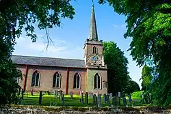 The church of St Giles was built in the 13th century using sandstone quarried from Hopwas Hayes wood. It was destroyed by fire in 1760, and was rebuilt largely in brick in the Georgian style. The church contains memorial panelling for Samuel Lipscomb Seckham (1827–1900), architect and High Sheriff of Staffordshire, who carried out a major restoration of Whittington Old Hall, in the late 19th century.[10]