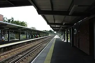 Whitton railway station is in the London Borough of Richmond upon Thames in southwest London, within Travelcard Zone 5. It is 12 miles 43 chains (20.2 km) down the line from London Waterloo. The station and all trains serving it are operated by South Western Railway. The station was extensively refurbished and its main buildings replaced 2015–2016. The footbridge was replaced so as to incorporate optional lifts to the platforms. Whitton station has a ticket office above the up (London-bound) platform containing a coffee shop, a taxi office, ticket machines and a disabled toilet. The station, to allow periods of no staff, lacks ticket barriers. The operator has had call at the station on most weekdays since 2014 air-conditioned, ten-coach trains.[2] The platforms were extended away from the building and footbridge in February 2012.