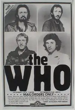 In September, the group made their first trip to the United States since 1976 for a series of shows at the Capitol Theatre in Passaic, New Jersey, and Madison Square Garden in New York City. A horn section was introduced to the band's act for the first time around this time. It would be retained through 1980. They returned to the States in November for an official tour, which was marred by tragedy when 11 fans were killed and 26 others were injured at a crowd crush before a concert at Riverfront Coliseum in Cincinnati on 3 December.[1] This led to the banning of festival seating in Cincinnati and many other cities and states around the United States for a considerable period.[2] The disaster also caused a scheduled concert for 17 December in Providence, Rhode Island, to be cancelled, leading to a second show in Landover, Maryland (the first was on 13 December) to be scheduled in its place. The group ended the year with a benefit appearance at the Hammersmith Odeon, London, on 28 December as part of the Concerts for the People of Kampuchea.[1]