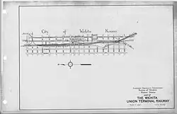 The Wichita Terminal Association (reporting mark WTA) is a switching and terminal railroad in northern Wichita, Kansas, jointly owned by the BNSF Railway and Union Pacific Railroad. It handles mainly grain and some scrap steel, serving customers at the former Wichita Union Stock Yards. The tracks were first placed in service in September 1889 by the stockyard and packing companies, and in February 1910 operations were transferred to the new WTA, owned by the Atchison, Topeka and Santa Fe Railway, Chicago, Rock Island and Pacific Railway, Missouri Pacific Railway, and St. Louis and San Francisco Railroad.[1][2] Through mergers, and the sale of the Rock Island's line to the Oklahoma, Kansas and Texas Railroad, the current split between BNSF and UP came about.