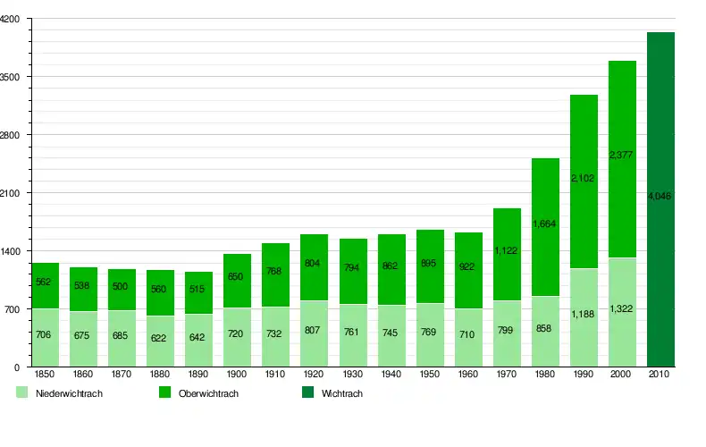 Wichtrach has a population (as of December 2020) of 4,377.[8] As of 2010, 5.4% of the population are resident foreign nationals. Over the last 10 years (2001-2011) the population has changed at a rate of 0%. Migration accounted for -0.6%, while births and deaths accounted for 0.5%.[9]