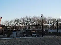 Ground was broken for the new station on August 18, 2010.[22] Primary construction work on the station platform and garage was completed on time and under budget in December 2011, and a test train was run to the station in March 2012.[14][23] The station opened on April 23, 2012.[24][20] A major part of the modern station is the four-story parking garage, which was modeled after the nearby Lafayette Mill. The garage includes an indoor waiting room—rare in the MBTA system—and a small coffee/snack shop.[25] An 8-foot (2.4 m)-tall bronze sculpture celebrating the history of rail service at Wickford Junction was completed in October 2015.[26]