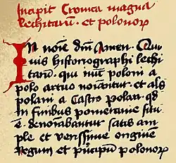 The Wielkopolska Chronicle (or Chronicle of Greater Poland, Polish: Kronika wielkopolska) is an anonymous medieval chronicle describing supposed history of Poland from legendary times up to the year 1273. It was written in Latin at the end of the 13th or the beginning of the 14th century.
