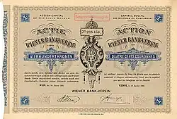 The Wiener Bankverein or Bank-Verein (WBV, lit. 'Viennese Bank Union') was a major bank in the Habsburg Monarchy and the First Austrian Republic, founded in 1869. In 1888 it was the fourth-largest bank of Austria-Hungary by market capitalization, behind the Austro-Hungarian Bank, the Länderbank, and the Creditanstalt.[1] It merged with the troubled Creditanstalt in 1934 to form Creditanstalt-Bankverein. Wiener Bankverein is thus one of the many predecessor entities of UniCredit, as the latter in 2005 acquired Bank Austria which itself had merged with Creditanstalt in 1997.[2]