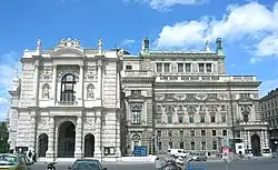 The Burgtheater (German: [ˈbʊʁk.teˌaːtɐ]; literally: "Castle Theater" but alternatively translated as "(Imperial) Court Theater", originally known as K.K. Theater an der Burg, then until 1918 as the K.K. Hofburgtheater, is the national theater of Austria in Vienna. It is the most important German-language theater and one of the most important theatres in the world.[1] The Burgtheater was opened in 1741 and has become known as die Burg by the Viennese population;[1] its theater company has created a traditional style and speech typical of Burgtheater performances.