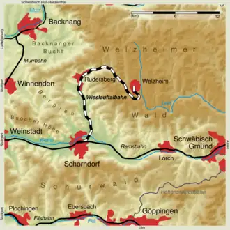 The Wieslauf Valley Railway (German: Wieslauftalbahn) is a branch line in the Stuttgart region of the German state of Baden-Württemberg. It is single-track and standard gauge, and was originally 22.8 km (14.2 mi) long, connecting the main Remsbahn line at Schorndorf to Welzheim. Today it is operated in two sections, with the first 11.5 km (7.1 mi) from Schorndorf to Rudersberg served by a regular passenger service, whilst the final 11.3 km (7.0 mi) forms a steam operated heritage railway.[1]