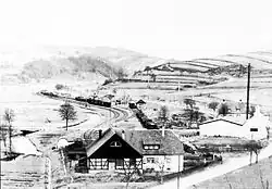 The Bruchweiler stop (also known as Bruchweiler-Bärenbach) is located at the entrance to Bruchweiler-Bärenbach. It was also formerly a station that was converted back into a stopping point as part of rationalization measures.[13] However, it never had a station building, only a waiting shelter.[56] In the 1950s, tickets were sold by a local greengrocer.[33]