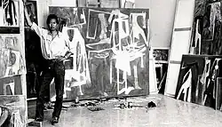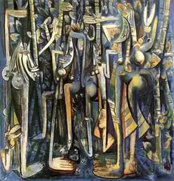 Additionally, his time in Cuba marked a rapid evolution of his style. Drawing from his study of tropical plants and familiarity with Afro-Cuban culture, his paintings became characterized by the presence of a hybrid figure—part human, part animal, and part vegetal.[2] His style was also distinctive because of its fusion of Surrealist and Cubist approaches with imagery and symbols from Santería.[9] In 1943, he began his best-known work, The Jungle. It reflected his mature style, depicting four figures with mask-like heads, half-emerging from dense tropical vegetation. Later that year it was shown in an exhibition at the Pierre Matisse Gallery in New York, where it created controversy. The painting depicted the tension between Modernism and the vibrancy and energy of African culture.[7] The Jungle was ultimately purchased by the Museum of Modern Art in New York. It is often compared to Picasso's Guernica, which is hung in the Museo Reina Sofía in Madrid.