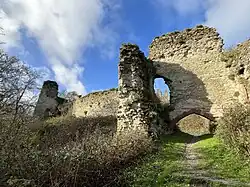 The castle was the subject of extensive works in the late 13th or early 14th century, when it was held by Roger Mortimer (1231-1282),[1] Edmund Mortimer (1282-1304) and Roger Mortimer, 1st Earl of March (lived 1287–1330).[2] The walls were raised, the gatehouse remodelled and other buildings were constructed on the site, including a substantial block, possibly a lodgings range, within the inner bailey.