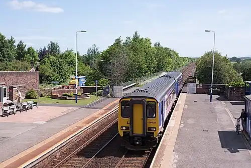 Wigton is one of the mandatory stops on this part of the Cumbrian Coast Line, along with Maryport and Workington. As with most other stations on the line, it is unstaffed, and has been so since 1969. The two side platforms here are slightly offset and linked by a footbridge. A ticket machine is now in service to allow intending travellers to buy before boarding.[5] There are waiting shelters on both platforms, but the surviving station buildings are no longer in railway use. Step-free access is available to each platform, whilst train running information is provided by display screens, telephone and timetable posters.