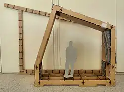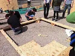 WikiHouse enables users to download Creative Commons-licensed files from its online library, customize them using SketchUp, and then use them to create jigsaw puzzle-like pieces out of plywood with a CNC router.[1][7] Construction of WikiHouse structures requires no special parts because the cut pieces of wood snap together with wedge and peg connections inspired by classical Korean architecture.[11][12] The frame of a WikiHouse can be assembled in less than a day by people with no formal training in construction.[11] The frame must then be finished with cladding, insulation, wiring, and plumbing before it can be inhabited.[2][12] The WikiHouse project is maintained by Open Systems Lab.[13]