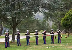 A rifle detail of Marines from Inspector-Instructor staff San Jose, Calif., fire a 21-gun salute in honor of the first Sergeant Major of the Marine Corps, Sgt. Maj. Wilbur Bestwick, at Skylawn Memorial Park Nov. 11, 2008