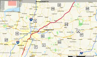 ![]() Map of northern Connecticut with Wilbur Cross Highway highlighted in red | |