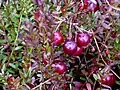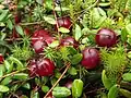 Vaccinium macrocarpon or Oxycoccus macrocarpus (large cranberry, American cranberry, bearberry) | It differs from V. oxycoccos in the leaves being larger, 10–20 mm (3⁄8–3⁄4 in) long, and flat, and in the slightly apple-like taste of the berries. | Native to northern North America across Canada, and eastern United States, south to North Carolina at high altitudes). |