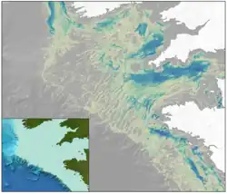 Fishing activities extracted from Automatic Identification Data of EU trawlers over the continental shelf,[2] highlighting the correlation with the bathymetry over the area (bottom-left, from the GEBCO world map 2014).