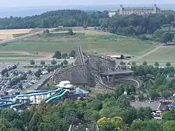 In June 1995, the Hershey Entertainment and Resorts Company announced that it would build "The Wildcat", a wooden roller coaster at Hersheypark in Hershey, Pennsylvania, over the following year.[2][3] The ride would be named after The Wild Cat, Hersheypark's first roller coaster, which operated from 1923 to 1945.[4][5] The coaster was intended as the main attraction in Midway America, an area in Hersheypark themed to classic American attractions;[2][6] construction of the themed area had begun the prior month.[3] Wildcat was the first coaster constructed by Pennsylvania firm Great Coasters International (GCI).[4][6] The 2-acre (0.81 ha) plot on which the ride was built had previously been used for parking.[7]