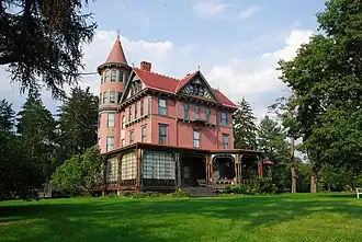 In 1888, Thomas Suckley's son Robert Bowne Suckley and his wife, Elizabeth Philips Montgomery, undertook a remodelling and enlargement of the house. This work was carried out by the architect Arnout Cannon of Poughkeepsie. The style of the mansion was changed to the eclectic Queen Anne style. A third floor, a multi-gabled attic, a circular five-storey tower, a porte-cochère, and a verandah were added in the process.[6][10] The new interior of the building was designed by Joseph Burr Tiffany, a cousin of Louis Comfort Tiffany. The rooms of ground floor were done in the Aesthetic Movement style using materials such as use mahogany, leather, stained glass, and linen.[11]