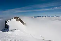 The Wildhorn is a mountain of the Alps, straddling the border between the Swiss cantons of Bern and Valais. At 3,250 metres (10,663 ft) above sea level, it is the highest summit of the Bernese Alps west of the Gemmi Pass. It forms a large glaciated massif, about 10 km wide, extending between the Sanetsch Pass and the Rawil Pass. Along with the Muverans, the Diablerets and the Wildstrubel, the Wildhorn is one of the four distinct mountain massifs of the Bernese Alps that lie west of the Gemmi Pass. The massif of the Wildhorn is at the centre between the valleys of the Saane, Simme (both canton of Bern) and the Rhone (Valais).[3] It comprises several distinct summits, including (from west to east) the Arpelistock, Le Sérac, the Geltenhorn, the Sex Noir, the Sex Rouge, the Schnidehorn and the Six des Eaux Froides. The main crest is between the glaciers named Tungelgletscher and Glacier du Wildhorn. South of the main summit is the almost equally high summit of Mont Pucel (3,177 m). The Wildhorn is surrounded by several large mountain lakes: the Lac de Sénin, the Lauenensee, the Iffigsee, the Lac de Tseuzier and the Lac des Audannes. The Tungelgletscher, on the north-east face, was measured as 1.9 km in length in 1973.[4]