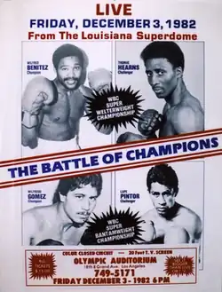 Following the cancellation of the "This Is It" card, Madison Square Garden officials were still interested in including the Benítez–Hearns fight on the undercard of the rescheduled Ken Norton–Gerry Cooney fight set for May 11, 1981.[6] Despite an offer of around $700,000, Benítez and manager Jimmy Jacobs rejected the offer in favor of a less–lucrative fight that would see Benítez moving up in weight and challenging WBC light middleweight champion Maurice Hope for his third world title.[7] Benítez would defeat Hope to become the youngest three–division world champion in boxing history at the time.[8] He would then make two successful title defenses against Carlos Santos and Roberto Durán before an agreement was reached in October 1982 to face Hearns on December 3 of that year.[9] The Benítez–Hearns fight was promoted by Don King with a co–main event featuring a super bantamweight championship fight between Wilfredo Gomez and Lupe Pintor in a fight card dubbed "The Carnival of Champions."[10] The massive Louisiana Superdome was chosen as the site for event and it was expected to draw a crowd of 40,000. However, ticket sales fell well short of expectations and King convinced Benítez and Hearns to take a $250,000 pay cut from their original $1.5 million purses, while Gomez and Pintor's purses of $750,000 were reduced by $125,000 in order to save the event.[11]