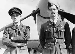 No. 19 Squadron returned to Duxford but was then shifted to nearby Fowlmere, as part of No. 12 Group which provided fighter cover for the Midlands.[13][14] In June the squadron took delivery of some Spitfires that were experimentally fitted with Hispano cannons but these proved problematic and were prone to jamming.[15] As the Battle of Britain escalated, the squadron was one of those that formed the Duxford Wing and were scrambled on several occasions in August to protect the airfields of No. 11 Group. On 9 August, while flying a cannon-equipped Spitfire, Clouston was credited with half shares in two Bf 109s shot down over the Thames Estuary.[16][17] Despite his success with the cannons, the squadron reverted to Spitfires equipped with the standard Browning machine guns in early September; too many instances of jammed cannons had compromised its efforts in destroying enemy aircraft.[15]