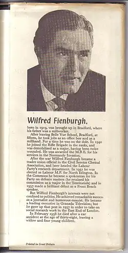 Commentators have expressed varying views of Fienburgh. Anthony Howard described him (in The Times 7 November 2000) as "rather louche", and Denis Healey asserted in his autobiography The Time of My Life (1989) that Fienburgh's "good looks and big brown eyes often led him astray".[4] Edward Pearce, writing in The Guardian, described him as a "delightful and amusing Labour politician".[5] Peter Hitchens in his book The Abolition of Britain described him as "one of the most talented men on the party's Left".[6] Fienburgh was allegedly involved in an altercation with Jennie Lee during the Labour Party conference in 1952, according to Lee's biographer Patricia Hollis.[7]