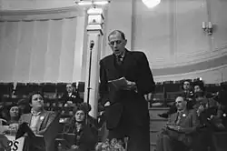 Roberts was a supporter of the Popular Front seeking an alliance between left-of-centre political forces.[26] The Popular Front was not officially endorsed by the Liberal Party, but was supported by a number of other Liberal MPs such as Megan Lloyd George and Richard Acland.[27] Roberts spoke at the 1938 Emergency Conference for a Popular Front.[28] He was embarrassed and angry, however, when he was chairing the Spain Conference in the Queen's Hall, and the "Internationale" was sung.[29] At this period he was an active speaker for the Left Book Club (LBC), a publishing company founded in 1936, with Acland.[30]