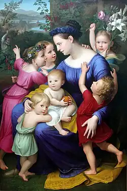 He continued to create paintings with military themes; including portraits of leaders he admired. He also painted genre scenes and works with religious themes. His self-portrait, and a contrasting portrayal of his wife, Henriette (1796-1851), and their six children, are among his most familiar works.
