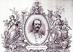 Wilhelm was the son of Jacob Freiherr Lenk von Wolfsberg, Colonel and Knight of the Military Order of Maria Theresa. He married on June 24, 1833, in Mainz Eveline Aloisia Schreher (b. November 2, 1810, Mainz; d. January 7, 1871, Troppau). They had five children. Rudolf (1834-1907), the eldest son, was an Austrian General, too. One of his daughters, Malwine (1839-1866), married the Austrian General Constantin Buol von Wischenau (1822-1893), the youngest, Friederike Berta (1843-1906), was the spouse of the deputy of the Austrian Imperial Council and large landowner's Karl Freiherr Putz von Rolsberg (1852-1921). She was the ancestress of the children of Count Alexander, son of Baron Alexander Wassilko von Serecki.[28][29]