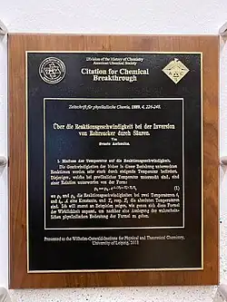 - 2018, Citations for Chemical Breakthrough Award from the American Chemical Society for the work of Svante Arrhenius on his Arrhenius equation, carried out and published at the Wilhelm Ostwald Institute in 1888/89.[18][19]
