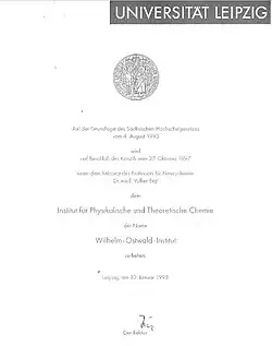 The Institute for Physical and Theoretical Chemistry has borne the official name "Wilhelm Ostwald Institute for Physical and Theoretical Chemistry" since the 1998 celebrations of the 100th anniversary of its inauguration in 1898.[1]