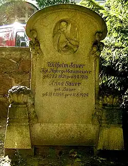 He married Minna Auguste Penske in 1859, the daughter of a cantor, and the couple had a daughter named Johanna (1859–1887). His wife died in 1876. On 7 September 1878, he married his second wife Anna Bauer (18 January 1848 – 11 August 1924). She was the daughter of a brewery owner and member of the city council in Potsdam.[4] They had two sons: Wilhelm (1879–1962) and Franz Gustav Adolf (1883–1945 missing). His grandson, Wolfgang Sauer (1920–1989), went to the United States in 1964 and became a professor of German history at the University of California, Berkeley.[11] Wilhelm Sauer's grave stone is now in Kleistpark in Frankfurt (Oder), where he died.