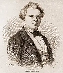 He studied at the Tübinger Stift in Tübingen, and from 1840 to 1847 served as an assistant pastor in Dettingen an der Erms and as a pastor in Hülben.[3] From 1847 to 1850, Zimmermann taught history at the Oberrealschule in Stuttgart. He was a democrat in philosophy and belief. Accordingly, he took part in the revolutionary uprising in Germany in 1848 through 1849. In 1848, he was elected as a deputy to the Frankfurt National Assembly. At assembly, he caucused with the "Left wing" deputies. In 1850, Zimmermann was dismissed from his position as a teacher at the Oberrealschule because of his participation in the revolution of 1848-1849 and because of his caucusing with the Left wing in the Frankfurt Assembly. Zimmermann died in 1878.[4]