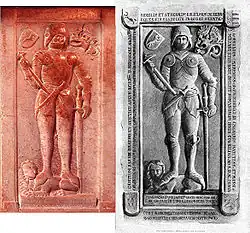 “The noble and strict Wilhelm von Bibra, Knight of the Golden Spur, from the Duchy of Eastern Franconia, adviser of the most noble and invincible emperor, Frederick III. and his son Maximilian, the well-known Roman king, representative and envoy to our Holy Lord Innocent VIII, as well as Court Administrator and councilor of the Archbishop of Cologne, Elector Hermann. After completing his mission on the way home from Rome, he died in the famous city of Verona on August 28, 1490. May his soul rest in peace! "