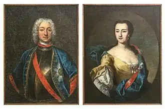 Wilhelmine von Grävenitz was born on 4 February 1684 in Schwerin[1] into the House of Grävenitz, a small German noble family with connections all over the Holy Roman Empire. In particular, she was daughter of Hans Friedrich von Grävenitz (1637-1697), Hofmarschall of Mecklenburg-Güstrow and his wife, Dorothea Margarethe von Wendessen (d. 1718). Her sister Eleonore served as lady-in-waiting and a confidante of Sophia Louise, Queen of Prussia, while her brother Friedrich Wilhelm was a councilor to Eberhard Louis, Duke of Württemberg. As Friedrich Wilhelm had no roots in Württemberg, his career depended on the Duke's goodwill. To secure his position, he invited Wilhelmine to the court of Württemberg.[2] Friedrich Wilhelm's desire to pair his sister with the Duke was supported by Hofmeister Johann Friedrich von Staffhorst and by Friedrich Wilhelm, Prince of Hohenzollern-Hechingen. Their motives for that support are unknown,[3] though their designs were frustrated when Wilhelmine contracted smallpox and her trip to Württemberg had to be delayed by a year.[4] She was married to Count Count Johann Franz Ferdinand von Würben und Freudenthal (1647–1720).[5]