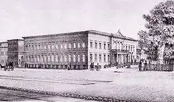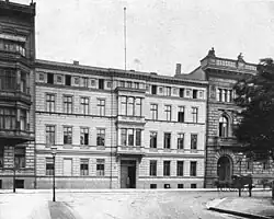 On the northern end of Wilhelmstraße it became apparent that there weren't enough private contractors for the property available. Frederick William I had to come to grips with the fact that, in order to populate the area, some corporations, guilds, state institutions and societies would need to resettle themselves from the southern part of the street, where they normally frequented.[11] Accordingly, a gold and silver manufacturer set up shop in the southwest corner of Wilhelmplatz at Wilhelmstraße 79, which had been built according to Gerlach's plans from 1735 to 1737. This particular manufacturer was also in possession of the Great Military Orphanage in Potsdam, which would be financed by this new endeavor. An additional building on the south side (No. 2) belonged to the same proprietors.[12] As for No. 79, from 1869 to 1876, it was expanded to include the neighboring property (No. 80) and the property toward Voßstraße (No. 35). This expansion accommodated the Prussian Minister of Trade and, beginning in 1878, the Minister of Public Works as well. During the Weimar Republic and Third Reich, the Reich's transportation ministry was located there for a time as well as a part of the train administration.